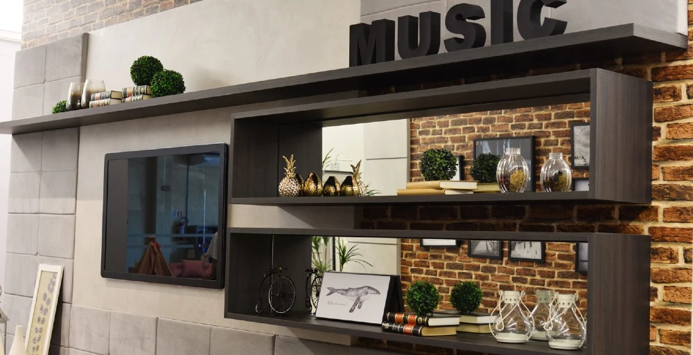 Assim como no outro projeto, alguns objetos foram essenciais para demarcar a personalidade do morador. Mas, diferente da outra opção, essa sala possui nichos aéreos, já que o ambiente é bem menor. Desse jeito, você aproveita o espaço que tem, sem perder a chance de decorar como deseja. A estante no topo do móvel deu uma sensação de amplitude na parede e os tijolos à mostra trouxeram um estilo mais moderno para a decoração.